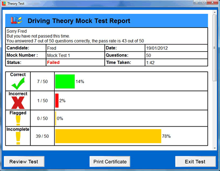 - 14 properly balanced pre-set simulated Theory Tests based on our extensive experience (as one of the largest national driving schools in the UK) of the most commonly occurring test questions all under realistic exam conditions.